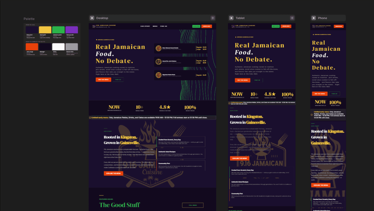 916 Jamaican Restaurant needed a digital presence that matched the warmth and authenticity of its cuisine. This project delivers a fully responsive, visually striking website built in Framer — designed to showcase the menu, tell the restaurant's story, and drive foot traffic from the local Gainesville community.